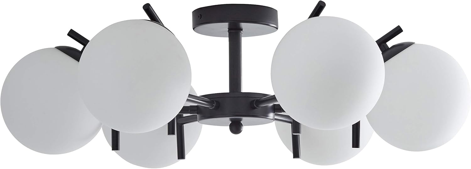 An Amazon Brand - Bathe your interiors in light with this large, multifaceted pendant. The 6 matte-black metal branches hold up 6 spherical lights with white glass shades that emit warm light in all directions.